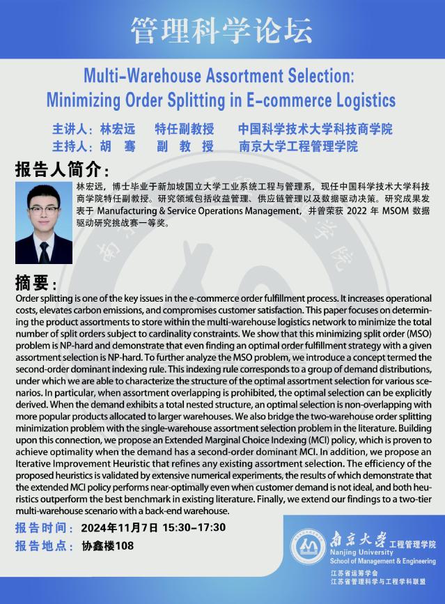 管理科学论坛:Multi-Warehouse Assortment Selection:Minimizing Order Splitting in E-commerce Logistics