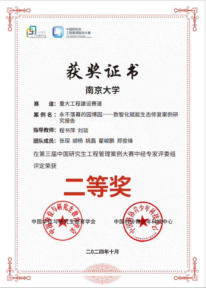 2024年10月26日,第三届中国研究生工程管理案例大赛全国总决赛在北京召开。由公司程书萍、刘琰等老师指导,MEM 2023级张琛、翟峻鹏、胡杨、姚磊、郑俊锋同学合作撰写的《永不落幕的园博园-数智化赋能生态修复案例研究报告》,与来自全国187家公司产品单位的572个优秀案例共同角逐,成功晋级全国总决赛,并斩获重大工程建设赛道二等奖。