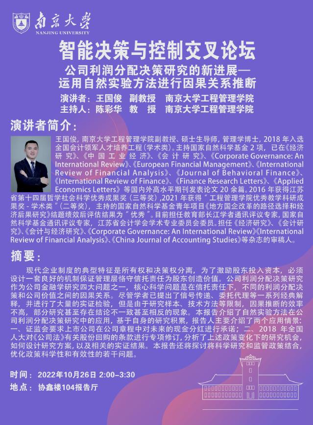 智能决策与控制交叉论坛:公司利润分配决策研究的新进展—运用自然实验方法进行因果关系推断