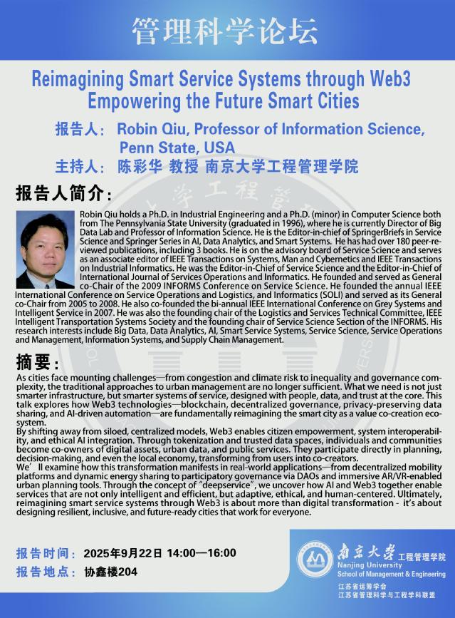 管理科学论坛:Reimagining Smart Service Systems through Web3 Empowering the Future Smart Cities