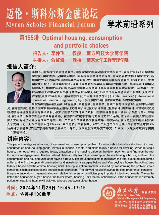 迈伦·斯科尔斯金融论坛:Optimal housing, consumption and portfolio choices
