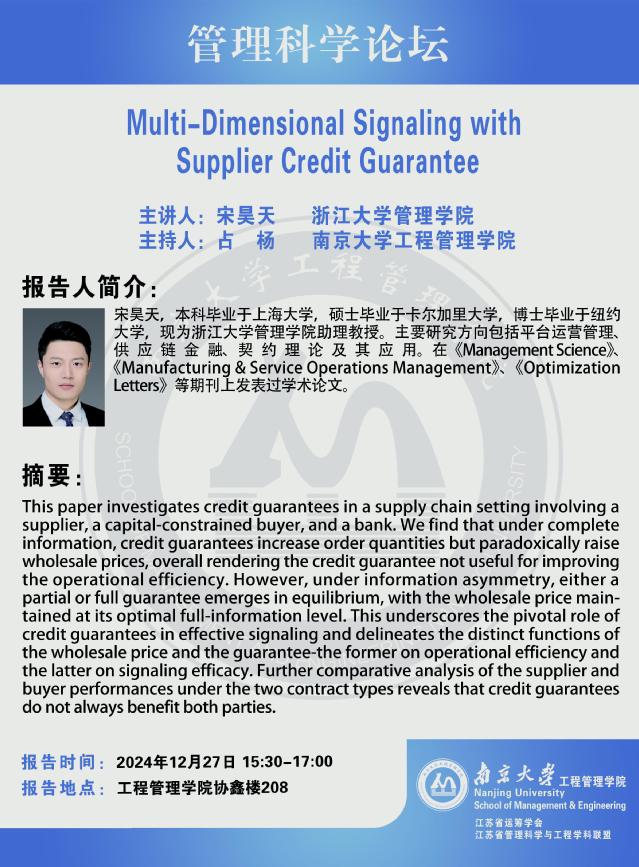 管理科学论坛:Multi-Dimensional Signaling with Supplier Credit Guarantee