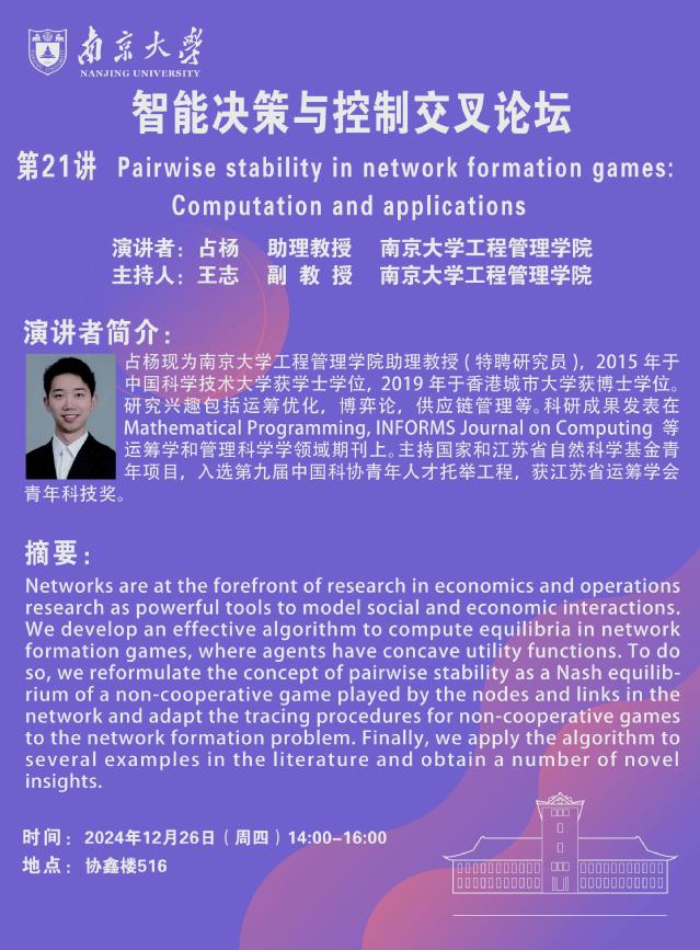 智能决策与控制交叉论坛: Pairwise stability in network formation games: Computation and applications