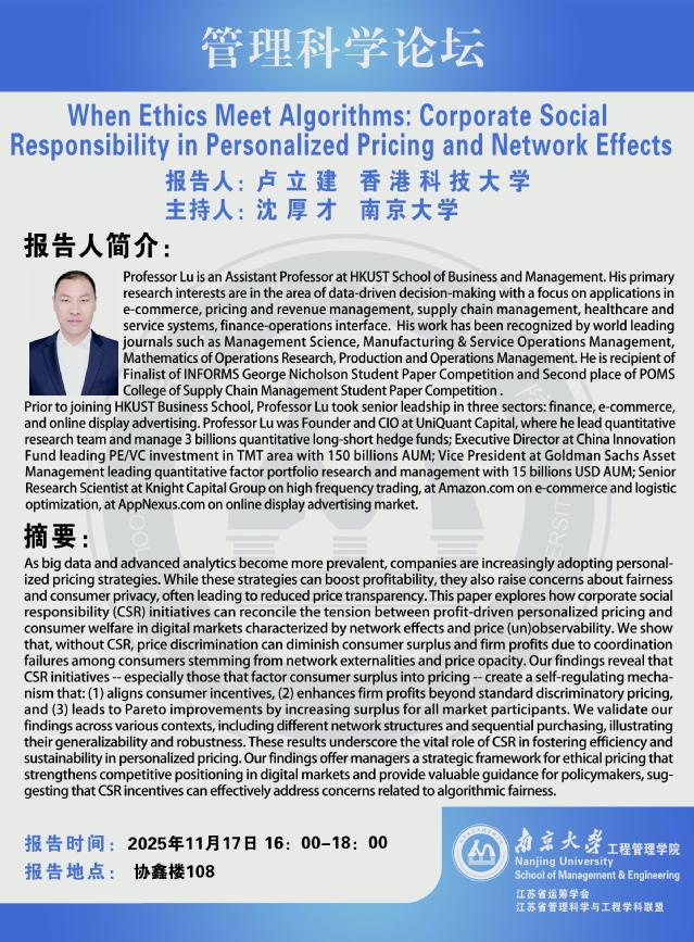 管理科学论坛:When Ethics Meet Algorithms: Corporate Social Responsibility in Personalized Pricing and Network Effects