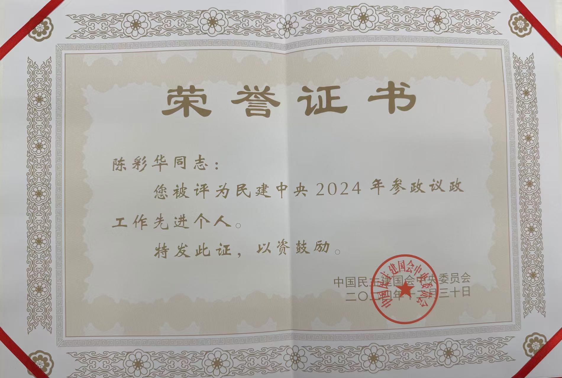 2024年12月30日,民建中央2024年参政议政年会在北京召开,全国政协副主席、民建中央常务副主席秦博勇,民建中央副主席孙东生、孙世杰等会中央领导出席会议,会议宣读了《民建中央关于表彰2024年参政议政工作的决定》。民建suncitygroup太阳集团基层委员会会员、公司陈彩华教授受邀参会,并荣获“民建中央2024年参政议政工作先进个人”称号。