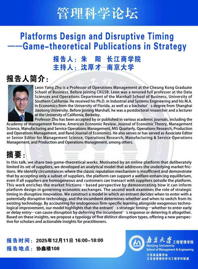 管理科学论坛:Platforms Design and Disruptive Timing——Game-theoretical Publications in Strategy
