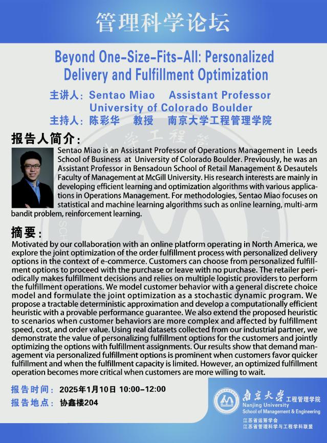 管理科学论坛:Beyond One-Size-Fits-All: PersonalizedDelivery and Fulfillment Optimization