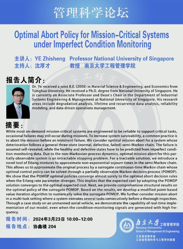 管理科学论坛:Optimal Abort Policy for Mission-Critical Systems under Imperfect Condition Monitoring