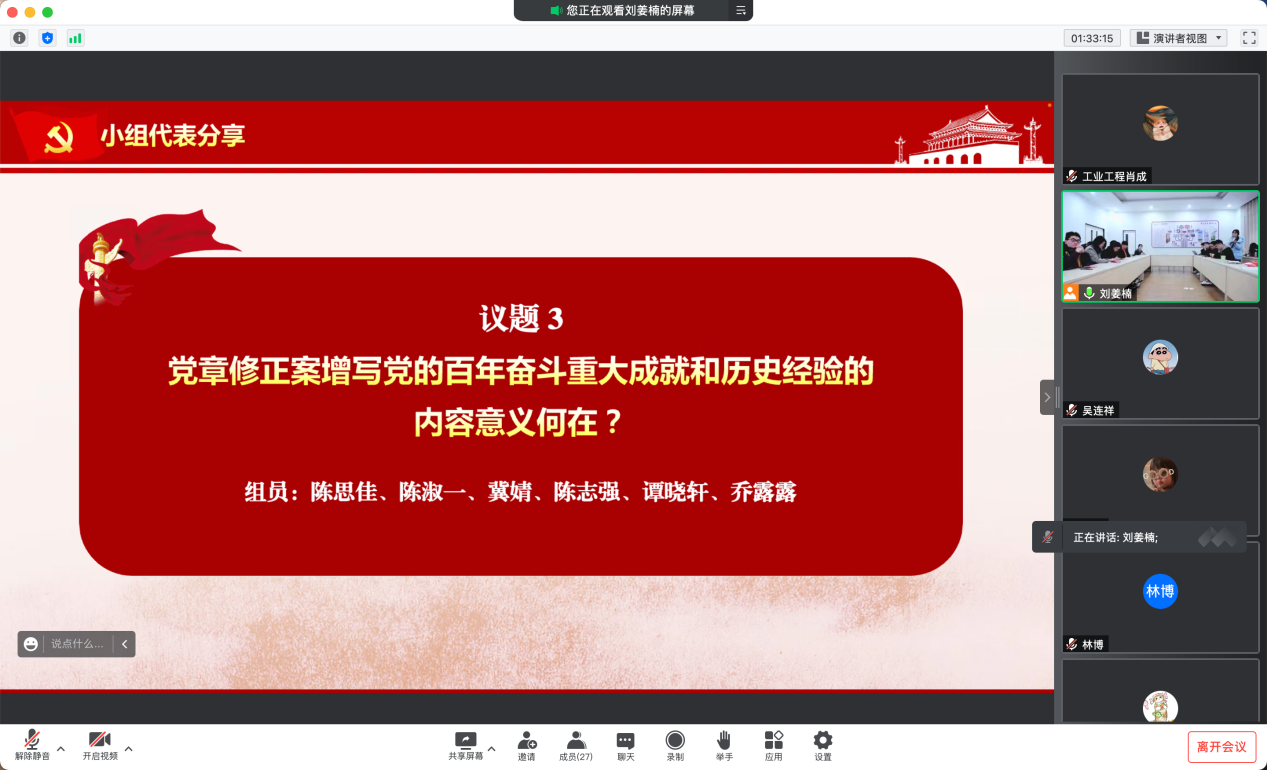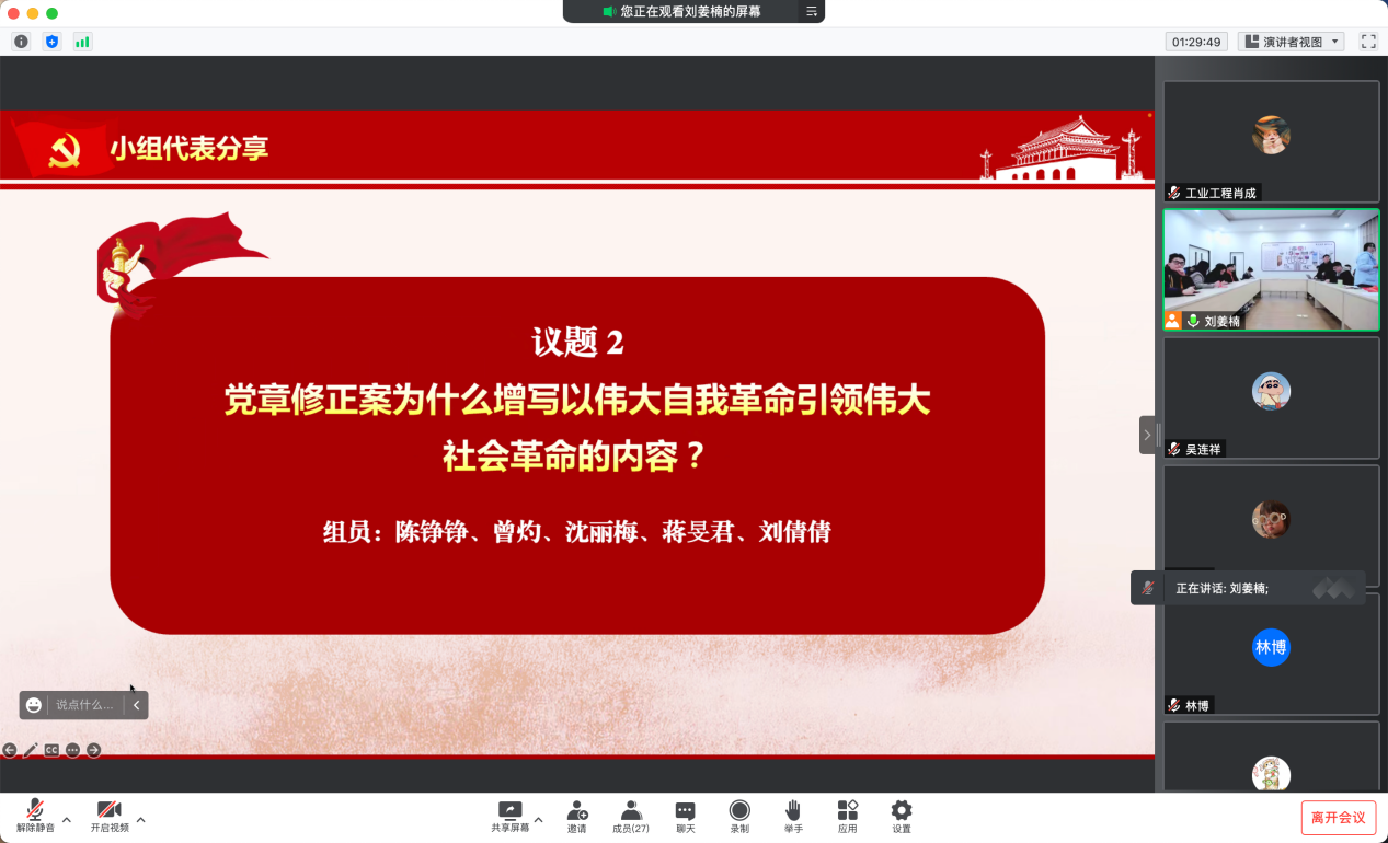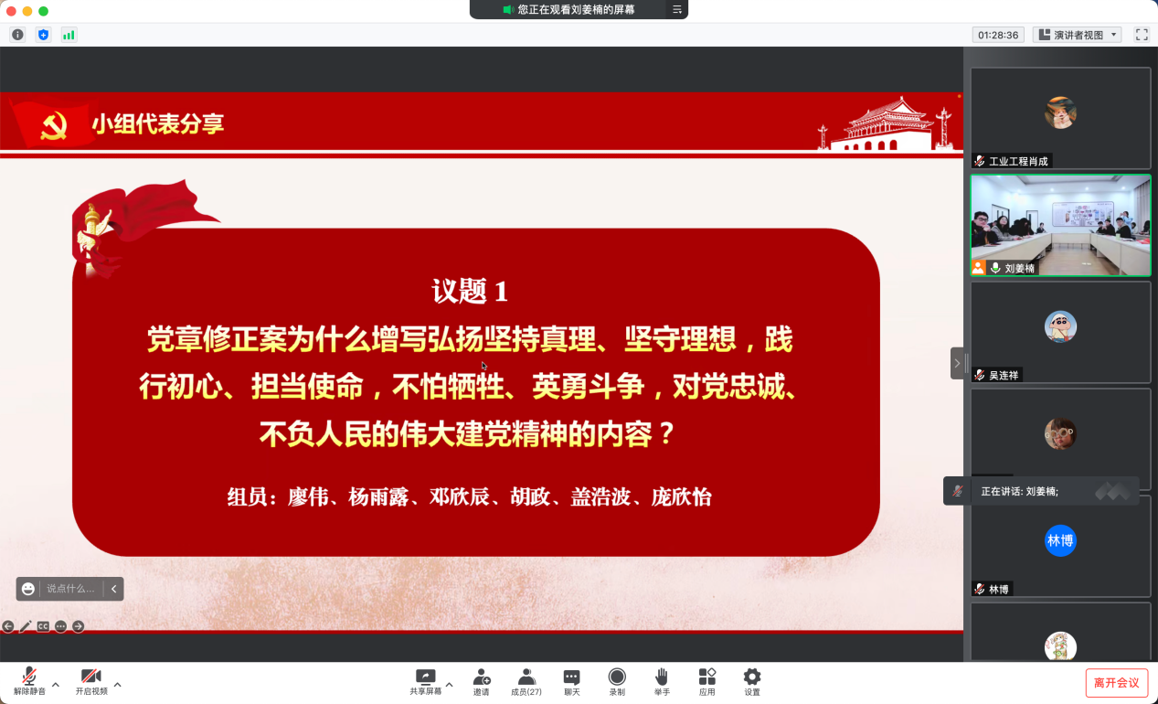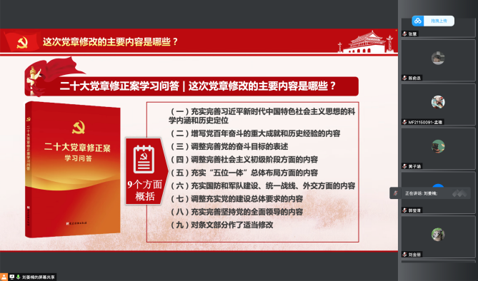 本次党日活动围绕《中国共产党章程》分三个模块开展了专题学习。首先,全体党员集中观看了《奋斗 新的伟业——新征程上党旗飘扬》微党课视频,对党章修改的历史背景及党章对党和国家事业发展所具有的意义有了基本了解。2021级硕士生工业工程党支部的陈文翔同志从《党章》的建设历程、修改的主要特点、必要性和重要性四个方面带领全体党员同志领学了修订后的《中国共产党章程》。2021级硕士生工程管理党支部宣传委员梁雪梅同志从九个方面概括讲述了党章修改的具体内容,加深了党员同志对新修改内容的理解和认识。