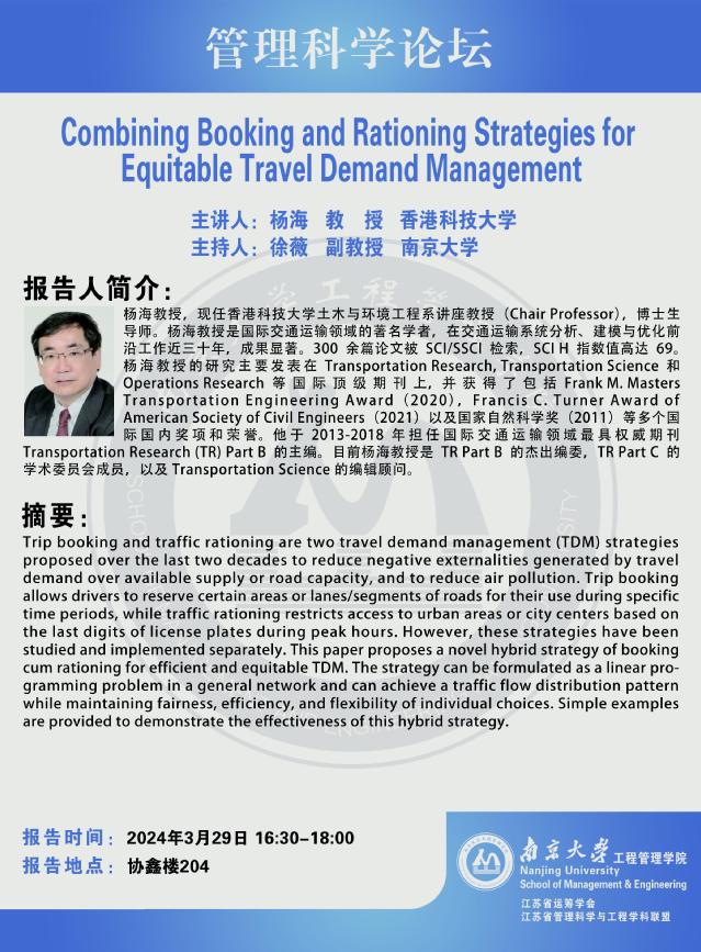 管理科学论坛:Combining Booking and Rationing Strategies for Equitable Travel Demand Management