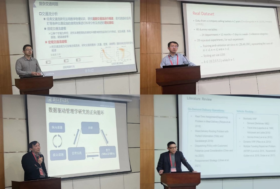 下午的五场报告分别由南京理工大学经济管理公司经理王玉东教授和东南大学经济管理公司副经理薛巍立教授主持。南京审计大学社会与经济研究院执行经理俞宁教授作题为《Job Matching under Interventions》的报告,以两篇相关研究入手,分别从市场干预的硬约束和软约束角度来进行市场设计。东南大学交通公司副经理刘志远教授作题为《处理复杂交通问题的改进高斯过程模型》的报告,提出了数据驱动的交通流模型,引入直接对变量之间的统计关系建模,不依赖均衡状态假设等方法,具有广泛的适用性。德克萨斯大学奥斯汀分校商公司高睿教授作题为《Optimal Robust Policy for Feature-Based Newsvendor》的报告。高教授研究了一种基于特征的报童问题策略优化,寻求一种端到端的,从特征到订购决策的明确映射。suncitygroup太阳集团商公司营销与电子商务系宋培建教授作题为《数据驱动的管理学实证研究:以两篇论文为例》的报告,以苏宁全渠道,线上下单门店自提和房间预订APP的后台数据两个具体问题为例,强调帮助企业决策需要实现降本增效。suncitygroup太阳集团罗志兴副教授作题为《On-Demand Delivery from Stores: Dynamic Dispatching and Routing with Random Demand》的报告,以准时性能为主要目标为最后一公里的配送系统进行建模,实现随机动态的调度和路径规划,并在大需求情景下依然保证性能。