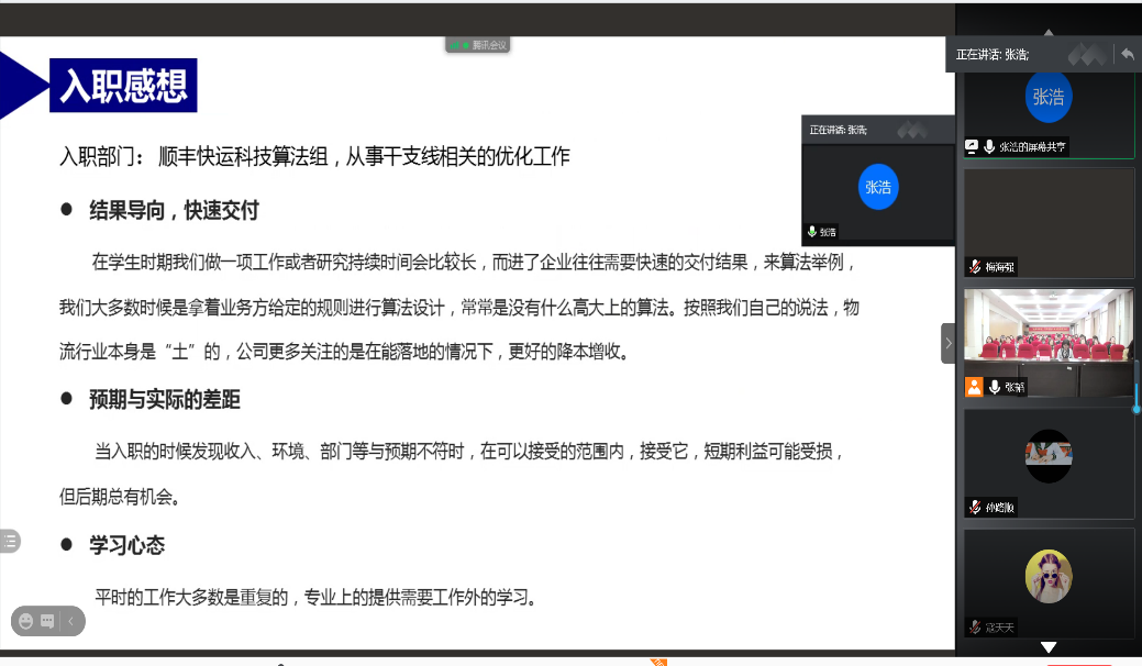 来自2017级物流工程专业的张浩目前就职于顺丰科技公司,是一名运筹优化算法工程师,他从自己的求职经历、入职感想和求职建议三个方面展开分享。在发表入职感想时,他认为步入工作岗位应尽快转变员工思维,工作中应权衡成本与收益,融入职业与行业情境,要以求真务实的态度面对工作。