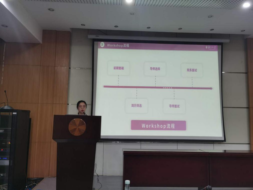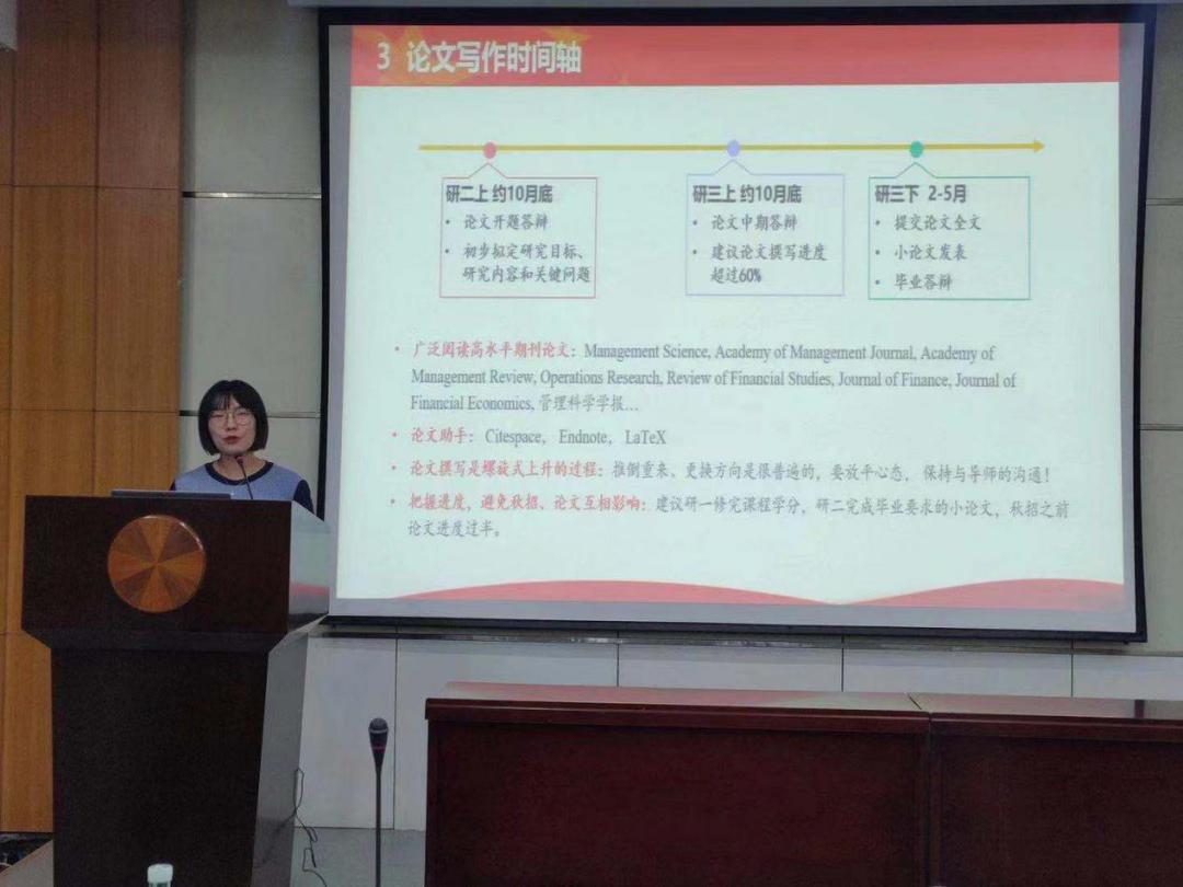 原公司研究生会主席赖苑苑带来了“如何高效度过研究生三年——开启工管人时间轴”主题分享,她从研究生整体安排时间轴、技能提升时间轴、论文写作时间轴以及考博求职时间轴等四个角度分享了自己的学习和工作经验。她表示:三年研究生学习时间十分短暂,要尽早做好是否读博的决定,充分利用课余时间全面提升自己,找准开启研究生高效时间轴的关键因素。
