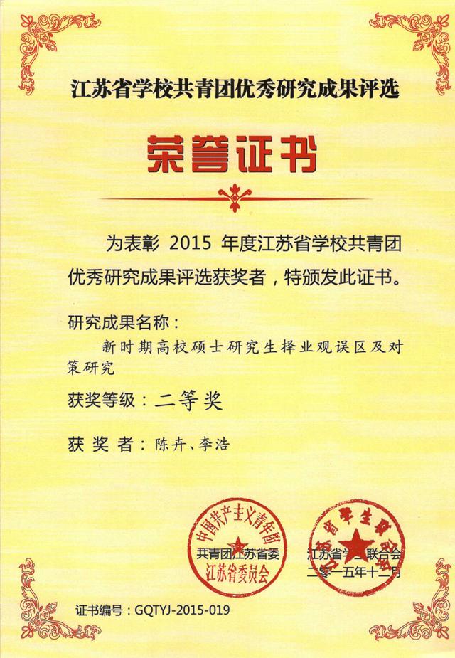 近日,团省委下发《关于公布2015年度江苏省公司共青团研究成果评选结果的通知》,由公司团委选送,公司党委副书记李浩与院团委副书记陈卉共同完成的工作论文《新时期高校硕士研究生择业观误区及对策研究》获得二等奖。