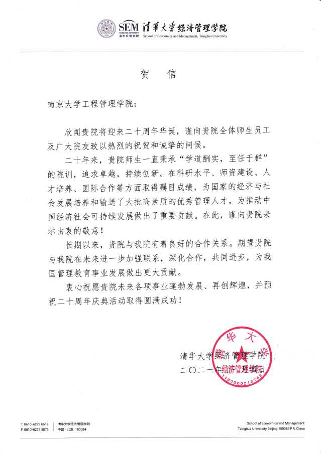 清华大学经济管理公司致suncitygroup太阳集团贺信