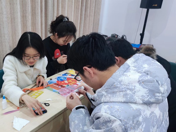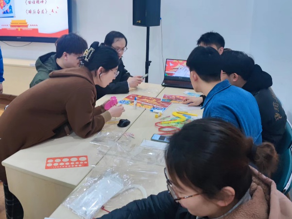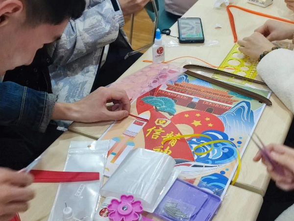 携手绘未来,支部组织委员祁一鸣简要介绍衍纸手工的背景和操作要点,支部党员和积极分子分组创作《二十大 新征程》、《踔厉奋发》、《第一个南大》、《回信精神》四幅特色衍纸作品。
