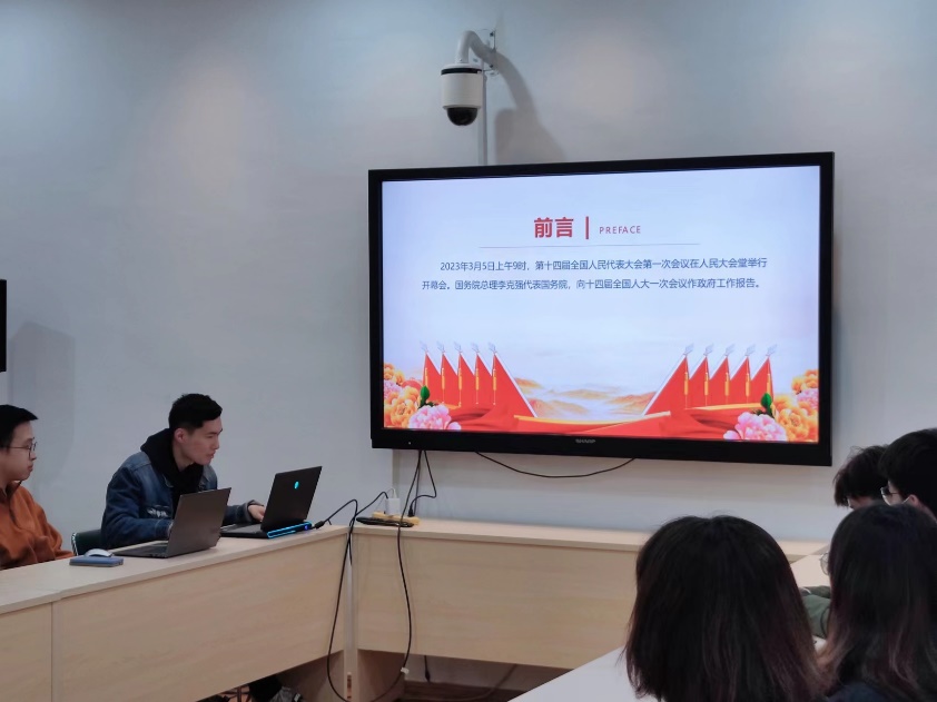 奋进新征程,支部宣传委员赵俊杰领学2023年政府工作报告。政府工作报告总结了党和政府过去一年与过去五年中的伟大成就,概括了党和政府对今年经济社会发展的总体规划。在讲解中,赵俊杰同志以人工智能技术应用的新视角切入,带领同学观看光明网《AI绘报告》和央视网《两会万象新》,引领在场同学身临其境体会伟大成就,明晰在新征程的重大责任。