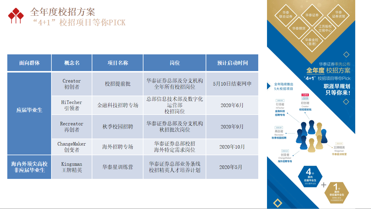 在同学们关心的应聘技巧、学习与实习如何平衡等问题上,孙源青认为最重要的关键词是“诚信”,以诚待人,才能换取真心。她强调不管是在应聘过程还是在未来从事金融行业时,诚信都是成功的根本要素;其次是“快速学习能力”,只有拥有这项能力,才能够在未来激烈的竞争中保持优势地位。不同阶段需要完成各自阶段的最主要的任务,学习是员工阶段的主要任务,只有在出色完成学习任务后,才应该将精力投入到各类的实习中去。在互动环节中,同学们对华泰的实习生、校招项目进行了咨询,华泰团队也对“4+1”校招项目,华泰证券在2020年校园招聘的计划及流程进行了详细介绍。