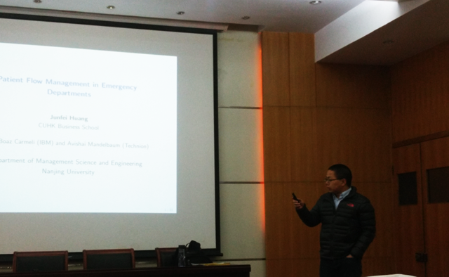2016年1月15日下午,香港中文大学商公司黄军飞教授在公司协鑫楼104报告厅做了题为《Patient Flow Management in Emergency Departments》的学术报告。此次报告作为又一期管理科学论坛,由公司管理科学与工程系沈厚才教授主持,数学系戴万阳教授和他的团队,以及公司感兴趣的师生参加了本次报告。