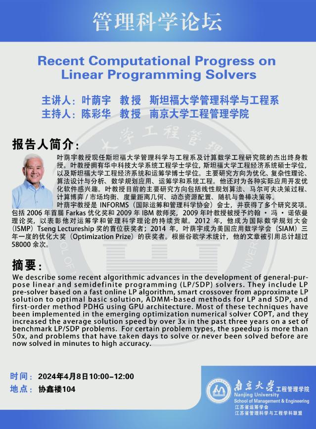 管理科学论坛:Recent Computational Progress on Linear Programming Solvers