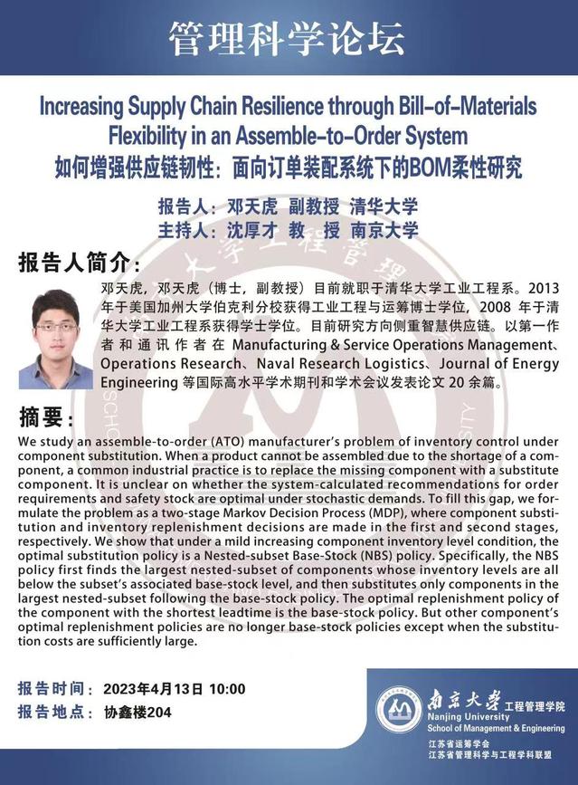 管理科学论坛: Increasing Supply Chain Resilience through Bill-of-Materials Flexibility in an Assemble-to-Order System