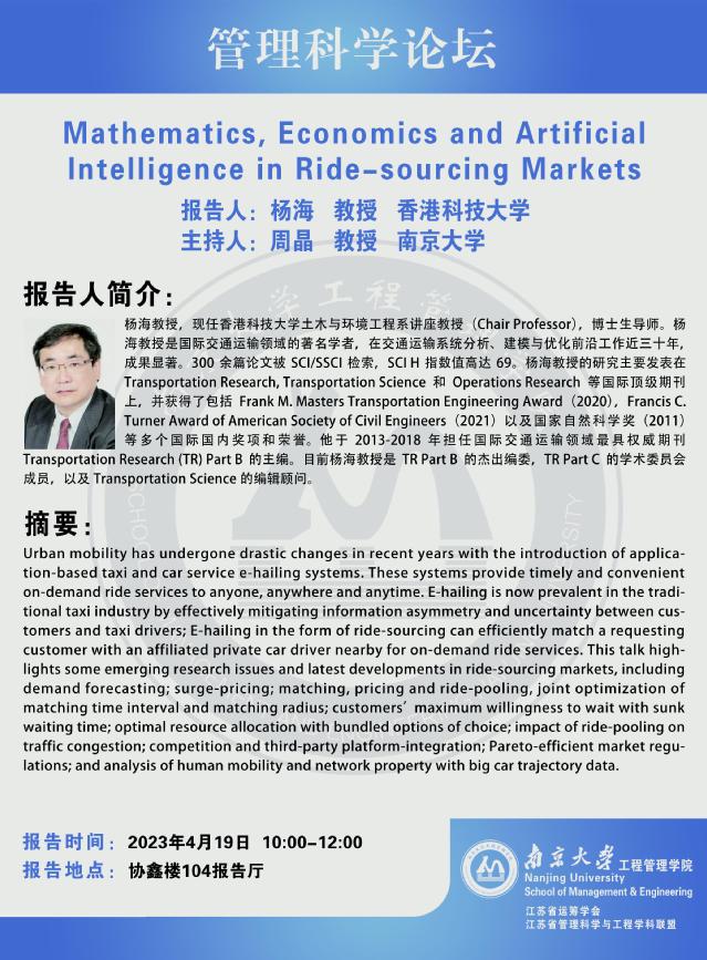 管理科学论坛:Mathematics, Economics and Artificial Intelligence in Ride-sourcing Markets