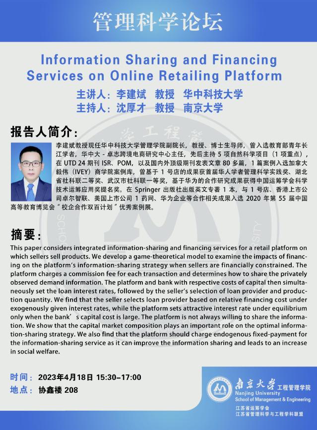 管理科学论坛:Information Sharing and Financing Services on Online Retailing Platform