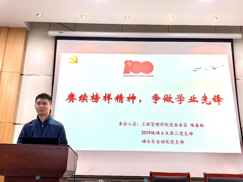 为深入学习习近平总书记在庆祝中国共产党成立100周年大会上重要讲话精神,响应“弘扬伟大建党精神,砥砺奋进爱国爱校”研究生主题教育月要求,2021年11月21日下午,suncitygroup太阳集团硕士生自动化党支部和2019级硕士生第三党支部在协鑫楼104会议室联合开展“赓续榜样精神,争做学业先锋”主题党日活动。