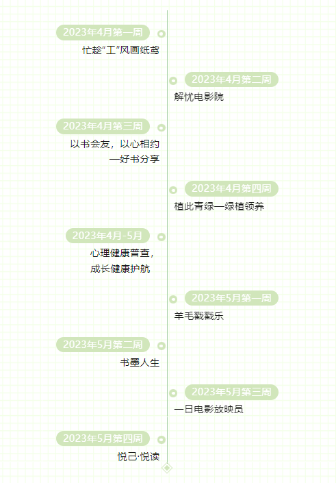 本学期,工管心空间推出了“筑梦心空间,启航心之旅”系列活动,花漾工管,绘制纸鸢,解忧电影,心语心愿留言板,心育导师下午茶等活动已经如期和大家见面啦!后续还有更加丰富多彩的活动,快来看看心空间系列活动周历吧~【附上心空间的推送链接】