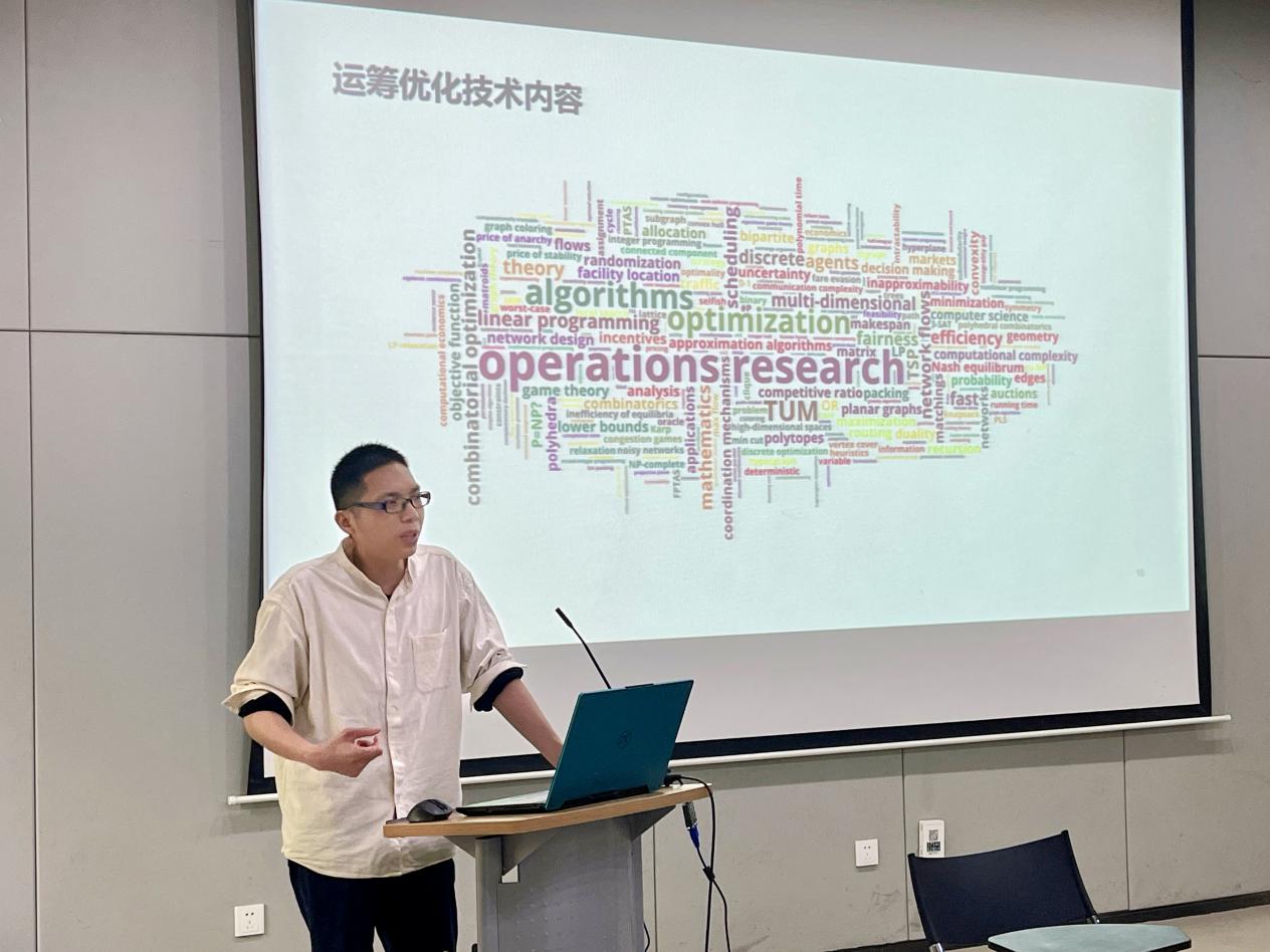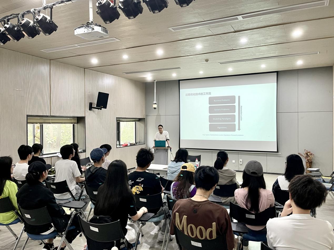 报告中,罗志兴副教授以《运筹优化算法设计》为题,从运筹优化的应用场景、技术特点、算法设计与案例分析四个方面进行介绍。他表示运筹优化算法在生产制造、物流供应链等领域都有着广泛的应用,与工业工程与运营管理系各位同学的研究方向、未来发展息息相关。