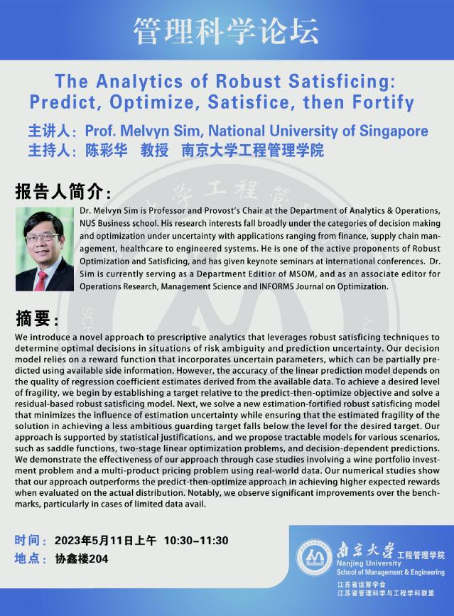 管理科学论坛:The Analytics of Robust Satisficing: Predict, Optimize, Satisfice, then Fortify