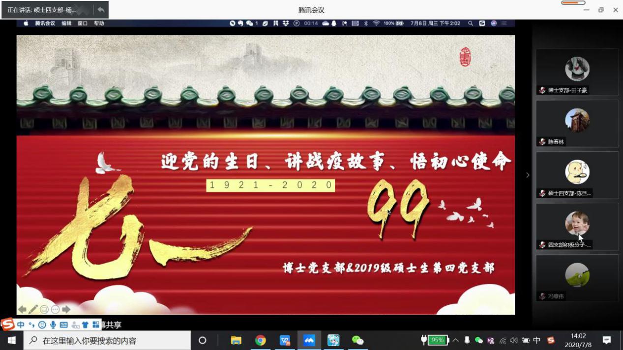 除了听抗击疫情的故事,在各支部的组织生活会上,党员们也纷纷讲述了自己的感悟和身边的故事。在2019级硕士生第三党支部的组织生活会上,吴超同学讲述了疫情期间祖国心系海外职工的点点滴滴;吴祥同学介绍了自己家乡疫情防控的举措;张慎同学讲述了疫情期间,南老员工自发组织捐款捐物资团体支援湖北的行动;马思慧同学讲述了疫情初期医院物资紧缺,医护人员自制护具抗疫的感人故事;张韬同学讲述了他的同学参加武汉火神山、雷神山医院建设的事迹;诸葛倩分享了自己所在小区基层物业组织送菜,保障居民生活需要的故事。大家深有感触,表示岁月静好的背后是有人在替我们负重前行。