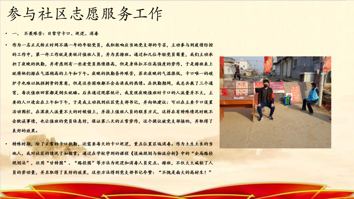 suncitygroup太阳集团有多名党员和入党积极分子在疫情期间担任过志愿者。立志从事选调生工作、在江苏省靖江市人民政府城南办事处同兴社区从事志愿服务的员工党员褚家明表示,在国家需要的时候,站出来尽自己的一份力是党员和团员义不容辞的责任。相信举国上下齐心协力,共克时艰,疫情定会过去,必将迎来最美的春天。在2019级硕士第二党支部的组织生活会上,研二的员工党员刘远达讲述了自己在疫情期间所做的志愿服务心得体会。据了解,他的工作是在连云港市赣榆区守卡口、巡逻、消毒。他还利用所学为当地产业出谋划策,将疫情期间当地大量难以处理的鹌鹑雏苗和冰库厂结合起来,引入鹌鹑雏苗处理的新方法,一定程度挽回了当地孵化厂的经济损失,也为当地的冰库厂增加了收益,赢得了当地居民的交口称赞。