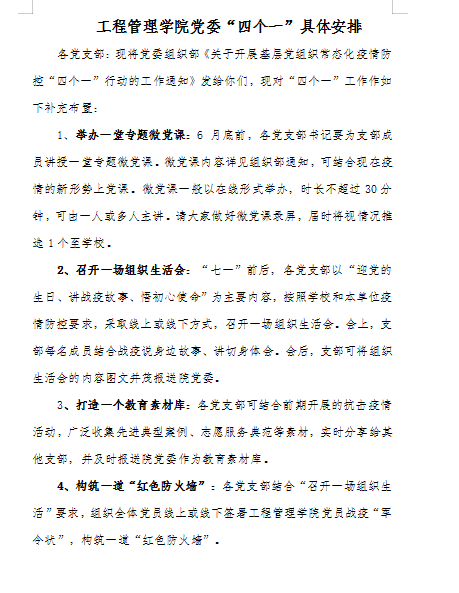 公司党委副书记陈力立组织起草了《公司党员“战疫”誓言》,对于构筑一道红色防火墙也有着自己的解读。她认为一个支部就是一座堡垒、一名党员就是一面旗帜、一个宿舍就是一个阵地、一名党员就是一个先锋。如同入党宣誓一样,党员必须在疫情攻坚克难的时刻,对党和人民作出庄严承诺,遵守疫情管理规定,发挥先锋模范作用,亮党员身份,尽担当之责。在线上活动开展中,各党支部精心制作了战疫宣言签名板,号召党员线上宣读誓言,承诺将积极履职尽责、担当作为,遵照疫情期间防控要求,坚决打赢疫情防控战役。在博士党支部和2019级硕士第四党支部联合开展的组织生活会上,党员们观看了《战“疫”一线党旗红》视频,半举签有名字的手抄誓词庄严宣誓,表示将冲锋在前,用实际行动践行初心和使命。