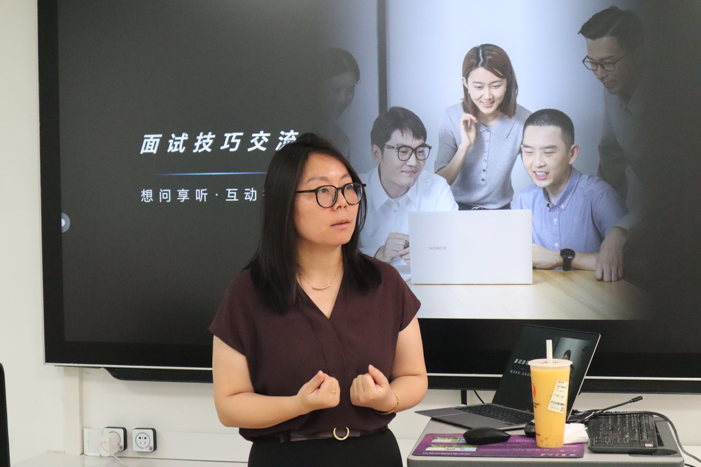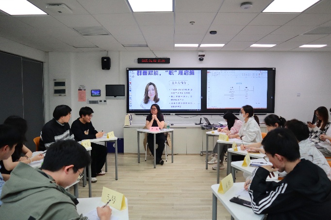 随后,罗毅为同学们介绍群体面试流程,由自我介绍、主题任务发布、个人准备、自由发表和面试官提问五个环节组成。她指出群面是非技术类岗位面试的第一环节,能否从群面脱颖而出是面试成功的一大关键。罗毅作为面试官对同学们进行了现场模拟面试,本次面试分为两组,第一组同学需要围绕如何决定自己的职业选择进行讨论和辩论,第二组同学需要对工作中可能出现的紧急情况制定解决方案。过程中,老师不仅从面试官的角度分析问题设置动机,还根据面试者的回答进行了精彩点评。