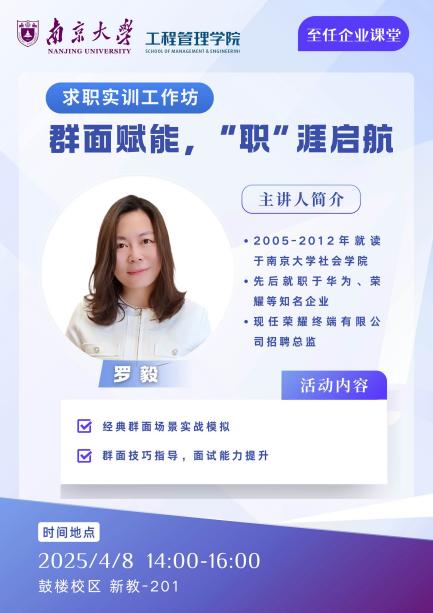 群面模拟结束后,罗毅总结了不同面试环节的考察重点以及常见群面题型,分享了集体面试中的技巧,鼓励大家有意识地培养自己的团队合作能力、解决问题能力、人际交往能力、情绪管理能力和领导力等。她指出了同学们身上普遍存在的一些问题,如准备性不足、自我介绍缺少记忆点和在讨论中缺少深度思考等,强调逻辑思考和表达清晰严谨十分重要,这需要不断练习和锻炼;此外,主动权应掌握在自己手中,要有意识的争取群面中的每一次发言机会。