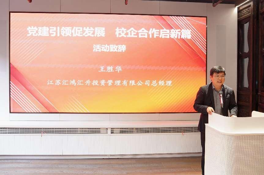 江苏汇鸿汇升投资管理有限公司总经理王胜华对师生们的到来表示欢迎,他介绍了汇鸿汇升投资的基本情况、创新业务和未来发展,并详细讲述了建设汇升投教基地的初心与过程。王胜华提出,希望通过共建进一步推动校企合作的“双向奔赴”,心怀投资者教育“国之大者”,共担中国特色金融发展之路的“时代重任”。俞红海首先向目前在汇鸿汇升投资公司工作的员工表达了公司的关心与问候。他强调,双方共建旨在进一步强化校企合作,资源共享、党员共育、活动共办,品牌共创,在党建引领下积极探索具有时代特点、体现行业特色的党建、专业人才培养融合载体。俞红海向同学们介绍了当前金融行业的发展形势、挑战与机遇,勉励大家牢牢把握时代机遇,充分利用广阔平台,与时代同步,实现更大发展。