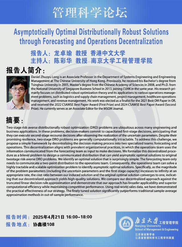 管理科学论坛:Asymptotically Optimal Distributionally Robust Solutions through Forecasting and Operations Decentralization