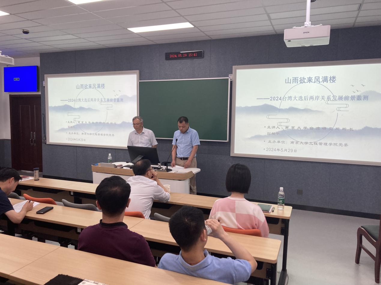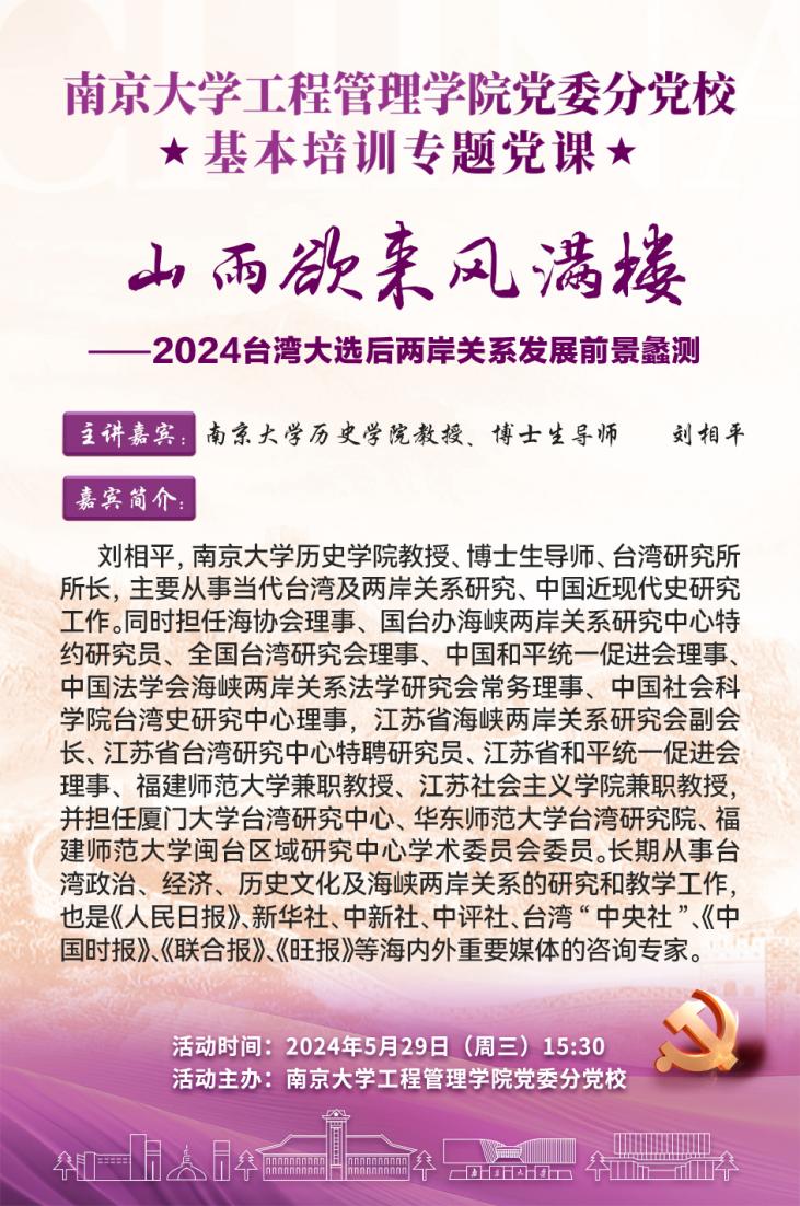 为进一步帮助广大党员了解2024台湾两项选举后的台湾政情,学习新时代党解决台湾问题的总体方略,2024年5月29日下午,suncitygroup太阳集团分党校邀请suncitygroup太阳集团历史公司博士生导师刘相平教授作“山雨欲来风满楼——2024台湾大选后两岸关系发展前景蠡测”专题党课。党课由公司党委书记陈志云主持,公司党政领导班子、党委委员、党支部书记及全体党员通过多个分会场共同参加此次党课学习。
