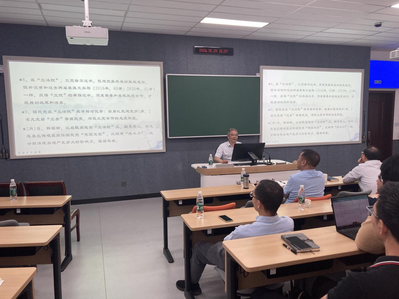 报告中,刘相平教授介绍了2024台湾两项选举后的台湾政情、台湾“总统”选举情况、台“立委”选举情况,分析了影响台湾2024年选举的原因,并对台湾两项选举选情及其背后政治生态作出详细阐述。刘教授表示在看待两岸关系上,应该坚持贯彻新时代党解决台湾问题的总体方略,一是应全面、准确理解和把握新时代党解决台湾问题总体方略的核心内涵;二是要坚持贯彻新时代党解决台湾问题的总体方略,紧紧围绕党的中心任务,服从服务于中华民族伟大复兴的宏伟目标。他强调,要牢牢把握两岸关系发展的主导权和主动权,强大的军备是落实党解决台湾问题总体方略最坚实的保障,面对“顽固的‘台独分子’,必加大反制力度。