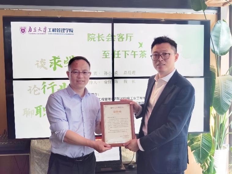 活动伊始,俞红海经理对孙小成重返母校表示热烈欢迎并授感谢函。他指出,优秀员工是公司发展的宝贵资源和重要支撑,“经理会客厅·至任下午茶”系列活动旨在加强员工和员工间的沟通,更加深入地探讨个人发展路径的选择。他强调,公司交叉学科背景对员工视野拓展有所助益,希望同学们能以优秀员工为榜样,将理论学习与实践探索有机融合。