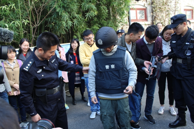 上午10时许,suncitygroup太阳集团内热闹异常,大家都被停在院门口的特警车辆所吸引。现场特警给同学展示了防弹衣帽、破拆器、92式手枪、79式微型冲锋枪等特种装备,详细讲解了装备的名称、使用方式,以及主要用途。在特警的帮助下,同学试着感受了防弹衣、防弹帽、手枪和冲锋枪。头一次见到特种装备的同学们充满了好奇心,与特警积极互动。