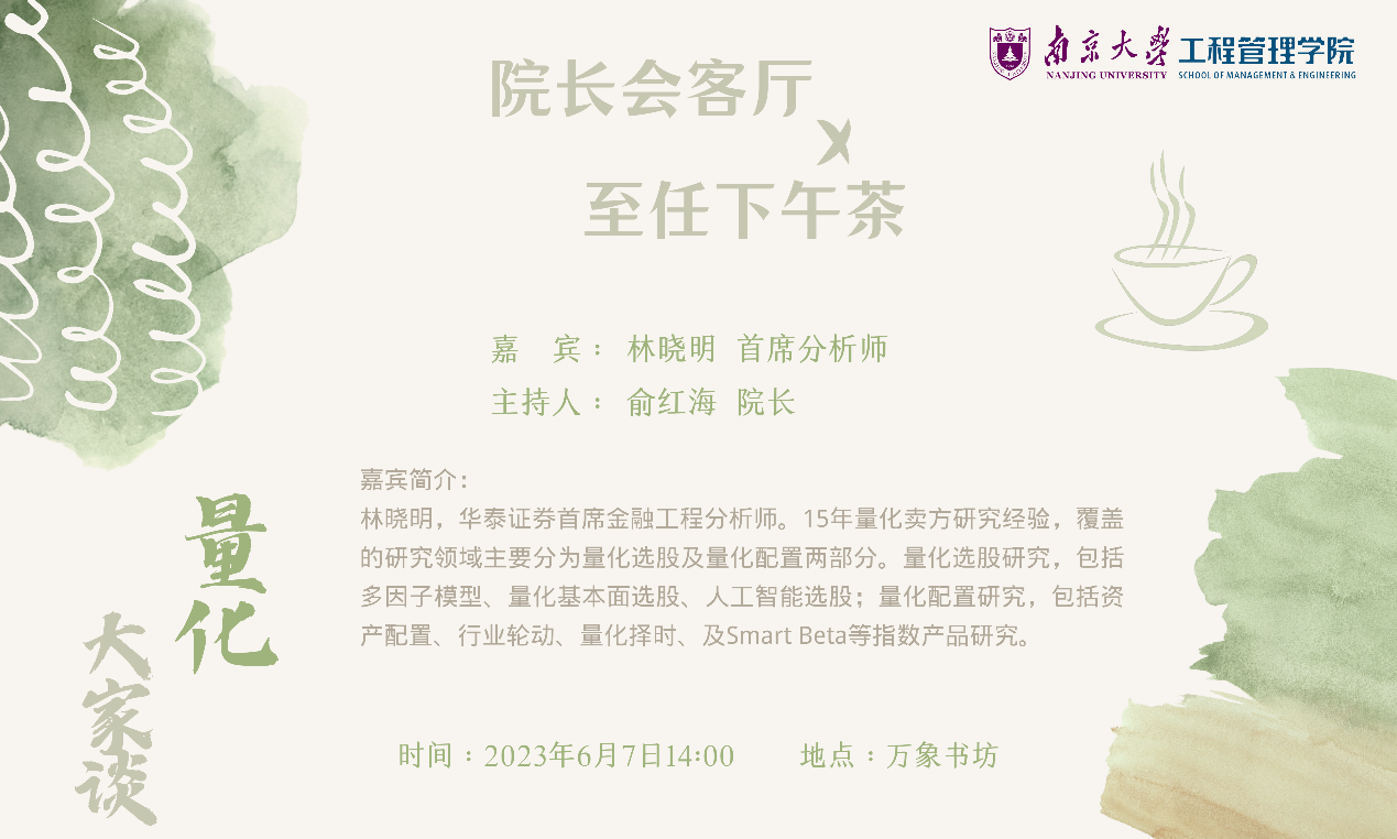 2023年6月7日下午14:00,“经理会客厅·至任下午茶”首场活动“量化投资大家谈”于万象书坊举行。本次活动邀请到华泰证券首席金融工程分析师林晓明作量化选股与量化配置方面的分享,suncitygroup太阳集团经理俞红海主持。
