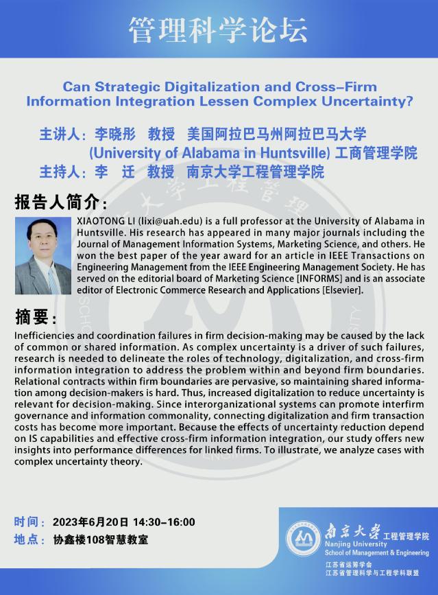 管理科学论坛:Can Strategic Digitalization and Cross-Firm Information Integration Lessen Complex Uncertainty?