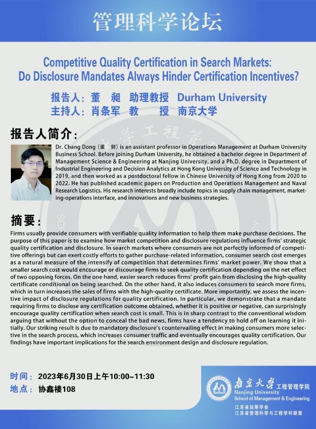 管理科学论坛:Competitive Quality Certification in Search Markets: Do Disclosure Mandates Always Hinder Certification Incentives?