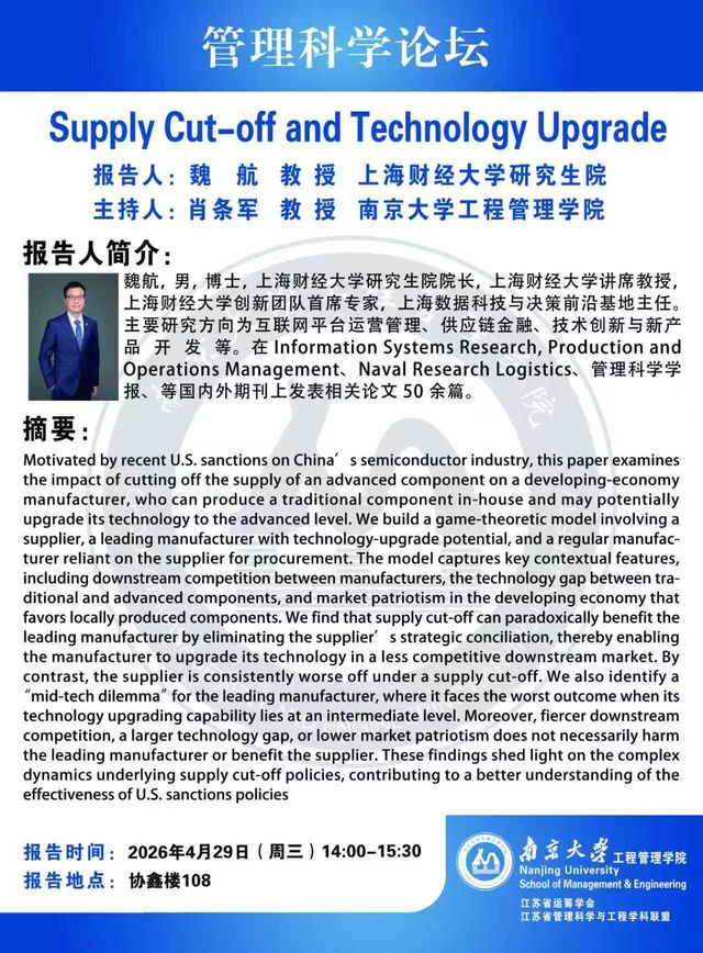 管理科学论坛:Supply Cut-off and Technology Upgrade