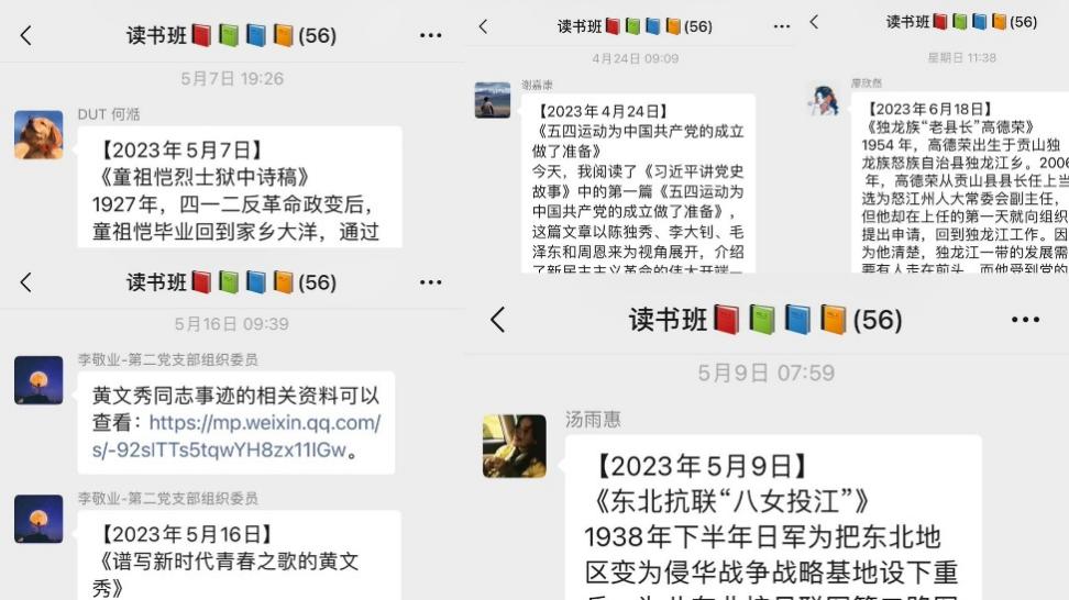 2023年4月24日至6月18日,两个支部全体党员、入党积极分子和入党申请人参加了“奋进读书会,坚定信念红”读书班活动,共同阅读《习近平讲党史故事》等书籍,分享自己的阅读感悟并发表在读书班群中,开展学习交流。双方支部共计56名同志在群内交流了学习感悟和心得体会。