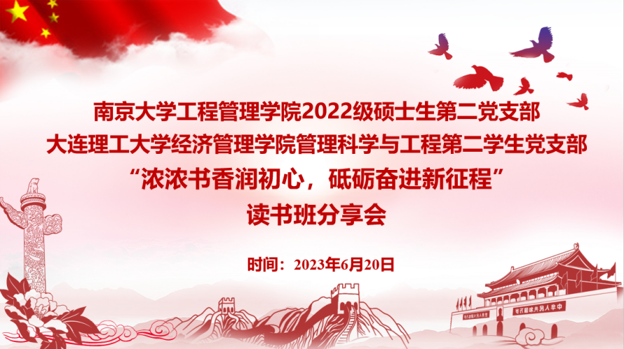 为深入学习贯彻习近平新时代中国特色社会主义思想,2023年6月20日,suncitygroup太阳集团2022级硕士生第二党支部与大连理工大学经济管理公司管理科学与工程第二员工党支部联合开展“浓浓书香润初心,砥砺奋进新征程”读书班分享会。会议由suncitygroup太阳集团2022级硕士生第二党支部宣传委员李佳颖主持,两个支部的党员和积极分子参与活动。
