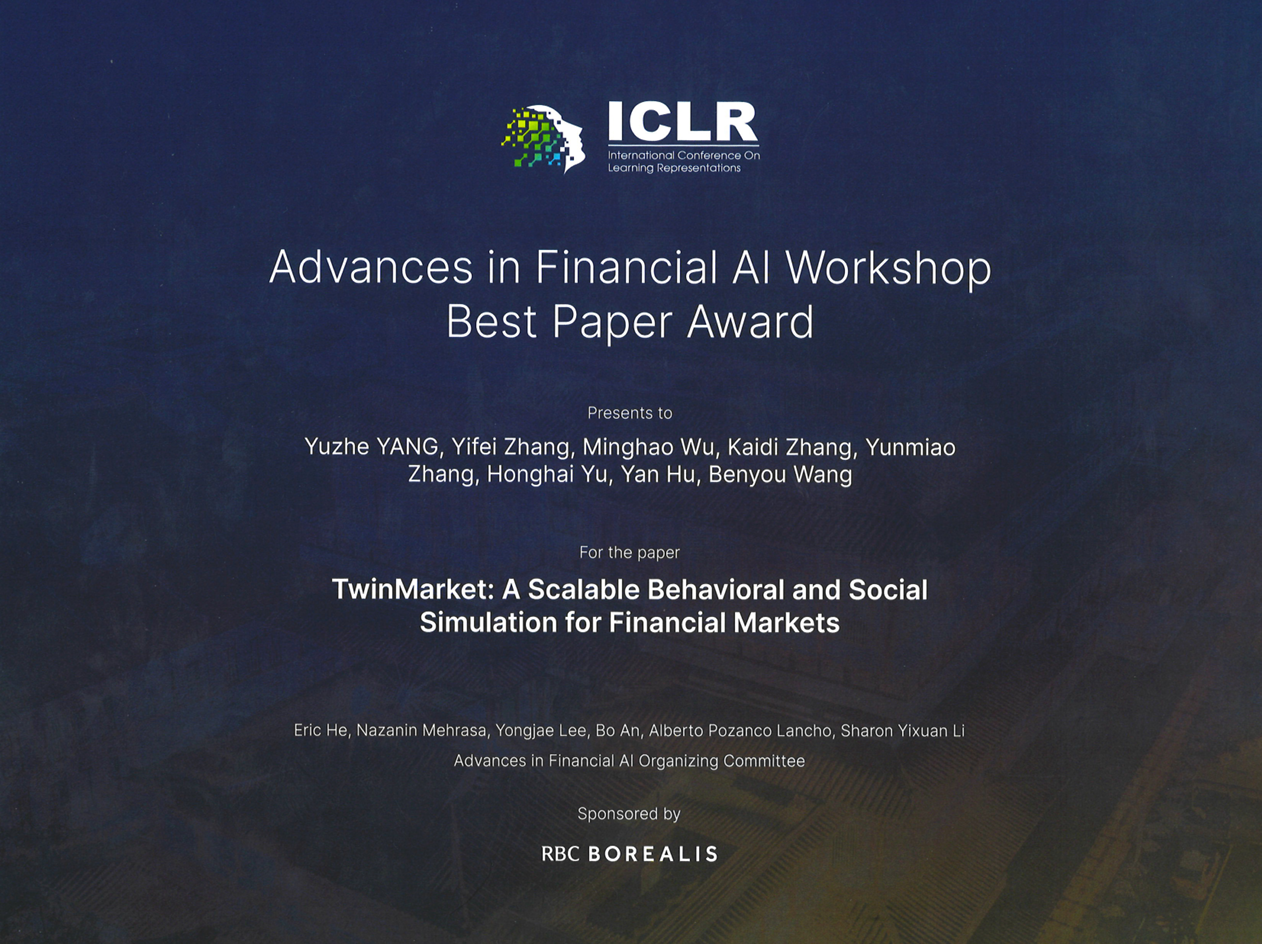 近日,人工智能领域顶级会议ICLR 2025 (International Conference on Learning Representations) 的金融人工智能研讨会(Advances in Financial AI Workshop)在新加坡召开,公司俞红海教授团队和香港中文大学(深圳)王本友教授团队合作完成的研究论文《TwinMarket: A Scalable Behavioral and Social Simulation for Financial Markets》荣获该研讨会唯一最佳论文奖(1 out of 53 accepted papers)。