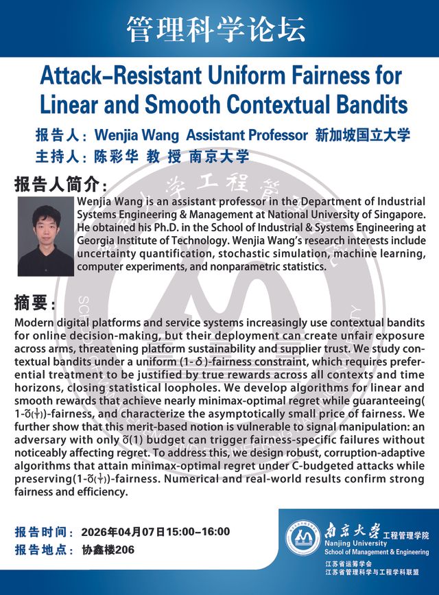 管理科学论坛:Attack-Resistant Uniform Fairness for Linear and Smooth Contextual Bandits